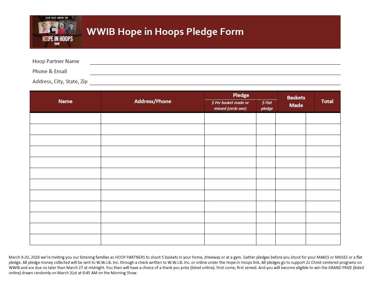 Pledge towards the basket that announcers and WWIB staff make. You'll be eligible to win prizes when you pledge. One prize per family per day. We'll call to let you know how many baskets were made of the 5 shots. Pledges can be mailed, delivered in person, paid online at wwib.com/giving or called in by credit card by March 31, 2026 and are TAX DEDUCTIBLE!
