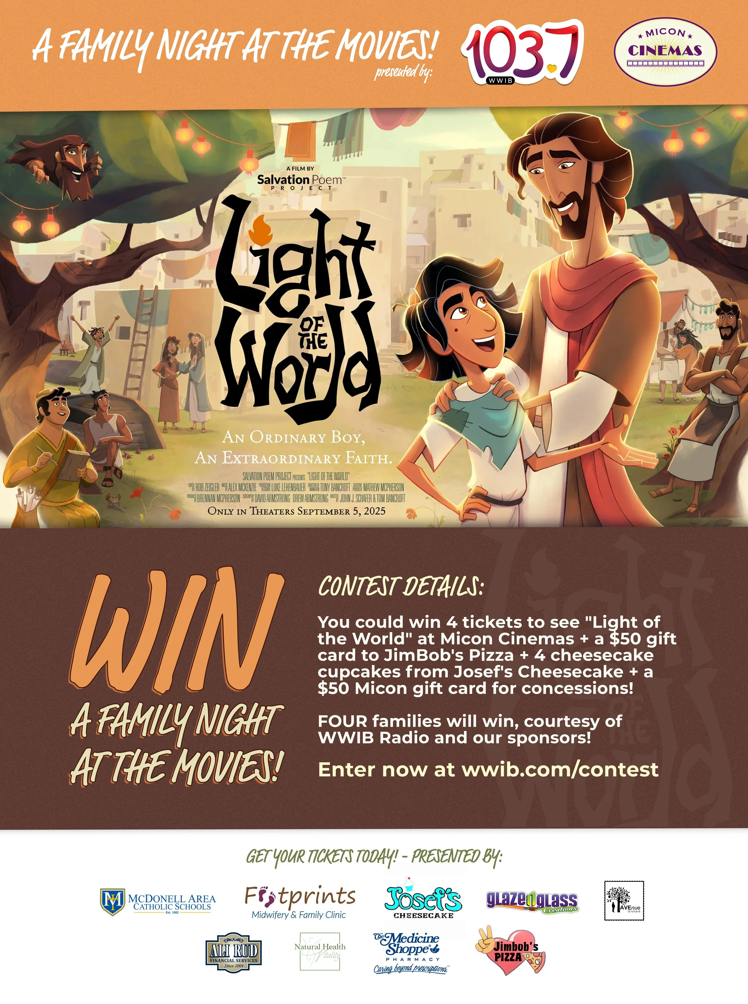 4 tickets to see “Light of the World” at Micon Cinemas Chippewa Falls or Micon Oakwood, a $50 gift card from JimBob’s Pizza (Market on River location in Chippewa Falls), 4 delicious cheesecake cupcakes from Josef’s Cheesecake in Chippewa Falls, AND a $50 Micon Cinemas gift card for your family’s favorite concessions!
